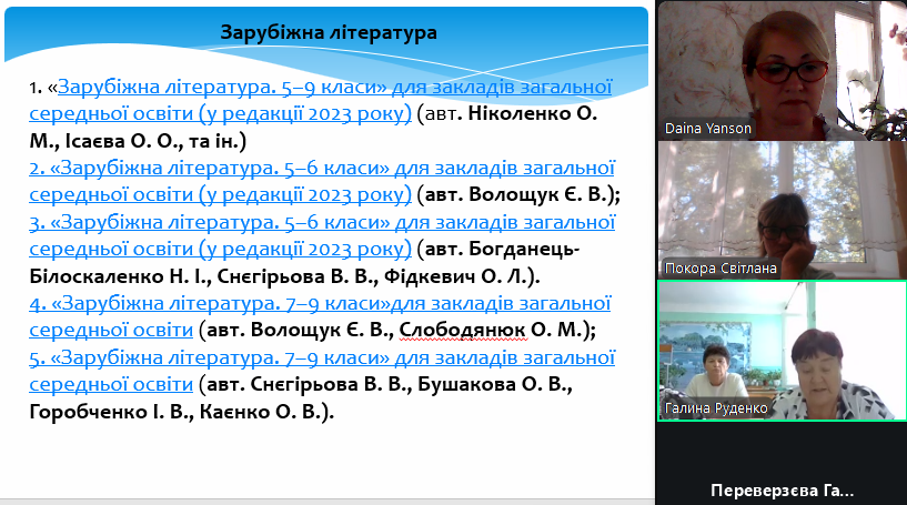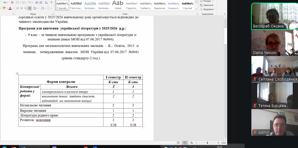 1) опрацьовано інструктивно – методичні рекомендації Міністерства освіти і науки України щодо викладання предметів мовно-літературної освітньої галузі в закладах загальної середньої освіти в 2025/2026 навчальному році: викладання української мови та літератури, зарубіжної літератури (5-8 класи, 9-11 класи), нормативно-правові документи, оцінювання учнів, планування уроків, форми роботи, види контролю, використання сучасних методів навчання, зокрема в контексті Нової української школи (НУШ), а також розподіл навчального часу відповідно до навчальних програм;