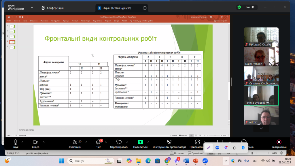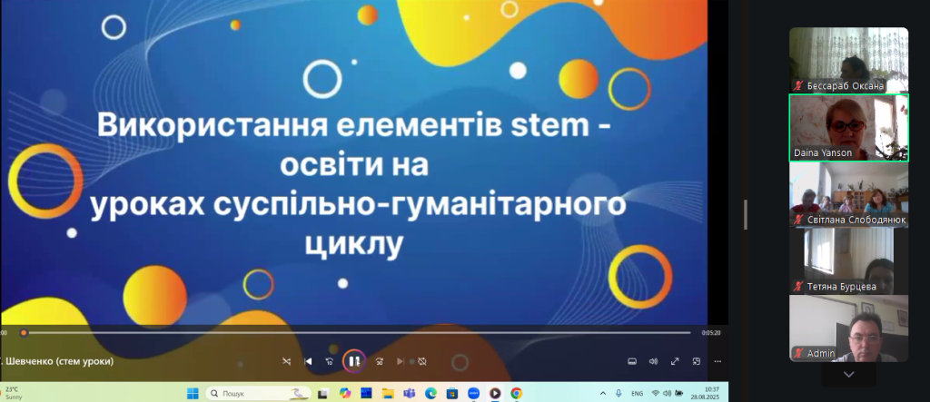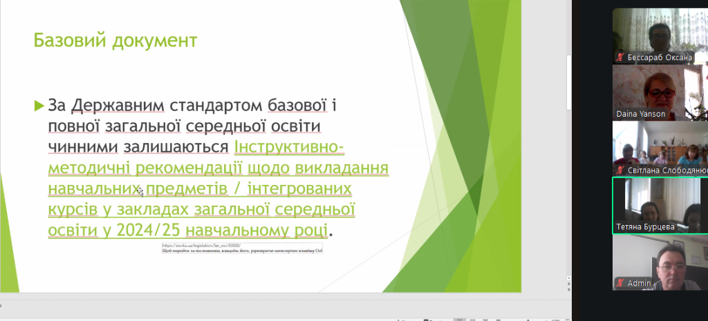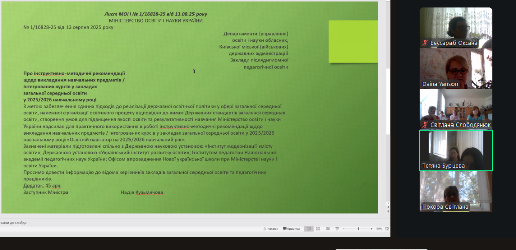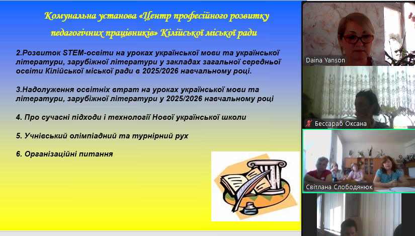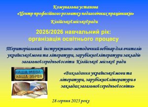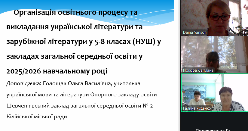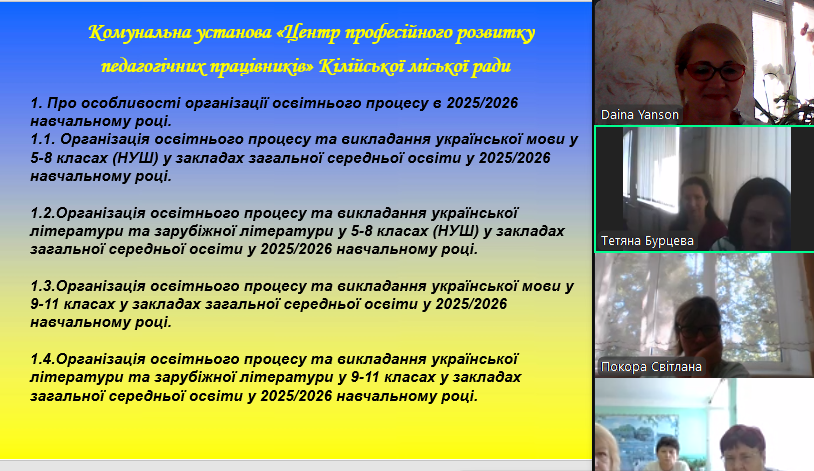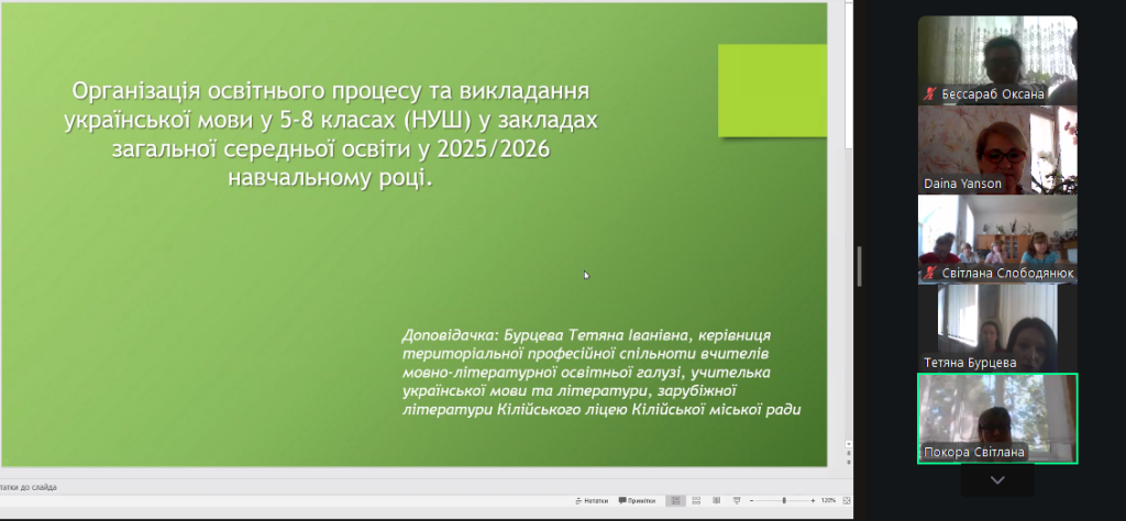 На виконання наказу Відділу освіти та молодіжної політики Кілійської міської ради «Про підготовку закладів та установ освіти Кілійської міської ради до початку 2025/2026 навчального року», відповідно до плану роботи Комунальної установи «Центр професійного розвитку педагогічних працівників» Кілійської міської ради, за координації консультантки Дайни Горбан, 28 серпня 2025 року, з метою забезпечення продуктивного старту нового навчального року, підтримки вчителів, у режимі онлайн на платформі Zoom, було проведено територіальний інструктивно – методичний вебінар для вчителів української мови та літератури, зарубіжної літератури закладів загальної середньої освіти Кілійської міської ради на тему «Готуємося до нового навчального року: організація освітнього процесу. Викладання української мови та літератури, зарубіжної літератури у закладах загальної середньої освіти в 2025/2026 навчальному році» (керівниця територіальної професійної спільноти предметів мовно-літературної освітньої галузі – Бурцева Тетяна Іванівна, учителька української мови та літератури, зарубіжної літератури Кілійського ліцею Кілійської міської ради).