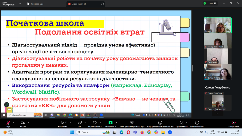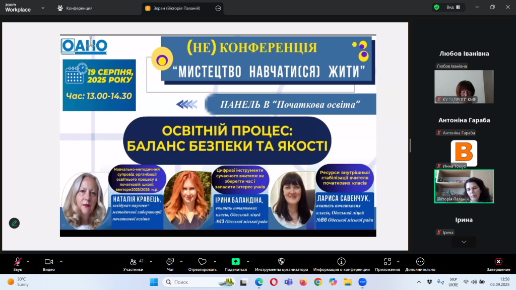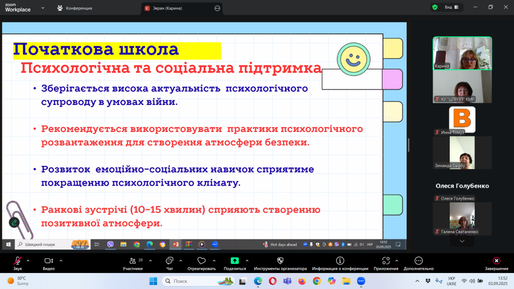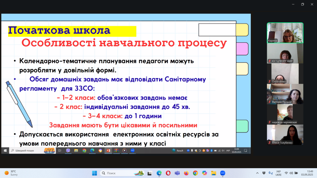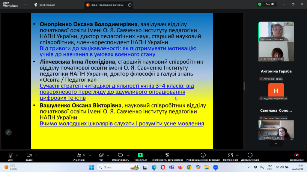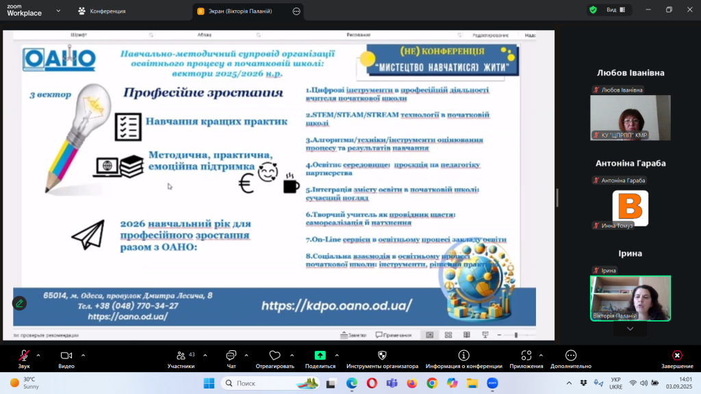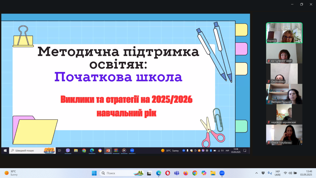 На виконання наказу Відділу освіти та молодіжної політики Кілійської міської ради «Про підготовку закладів та установ освіти Кілійської міської ради до початку 2025/2026 навчального року», відповідно до плану роботи Комунальної установи «Центр професійного розвитку педагогічних працівників» Кілійської міської ради, за координації консультантки Олени Барладян, 03 вересня 2025 року, з метою забезпечення продуктивного старту нового навчального року, підтримки вчителів, у режимі онлайн на платформі Zoom, було проведено територіальний інструктивно – методичний вебінар для заступників директорів з навчально – виховної роботи, учителів початкових класів закладів загальної середньої освіти Кілійської міської ради на тему «Методичний супровід організації освітнього процесу в 1-4 класах закладів загальної середньої освіти в 2025/2026 навчальному році».