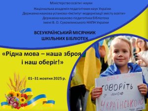 Протягом жовтня 2025 року учасники освітнього процесу 12 закладів загальної середньої освіти Кілійської міської ради, за координації Комунальної установи «Центр професійного розвитку педагогічних працівників» Кілійської міської ради (консультантки Горбан Дайни), взяли участь у Всеукраїнському місячнику шкільних бібліотек під гаслом «Рідна мова – наша зброя і наш оберіг!», який проведено відповідно до методичних рекомендацій та рекомендаційних бібліографічних списків, розроблених Державною науковою установою «Інститут модернізації змісту освіти» спільно з Державною науково-педагогічною бібліотекою України імені В.О. Сухомлинського.