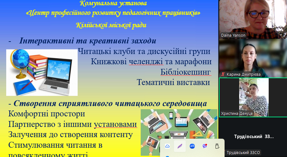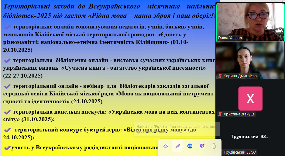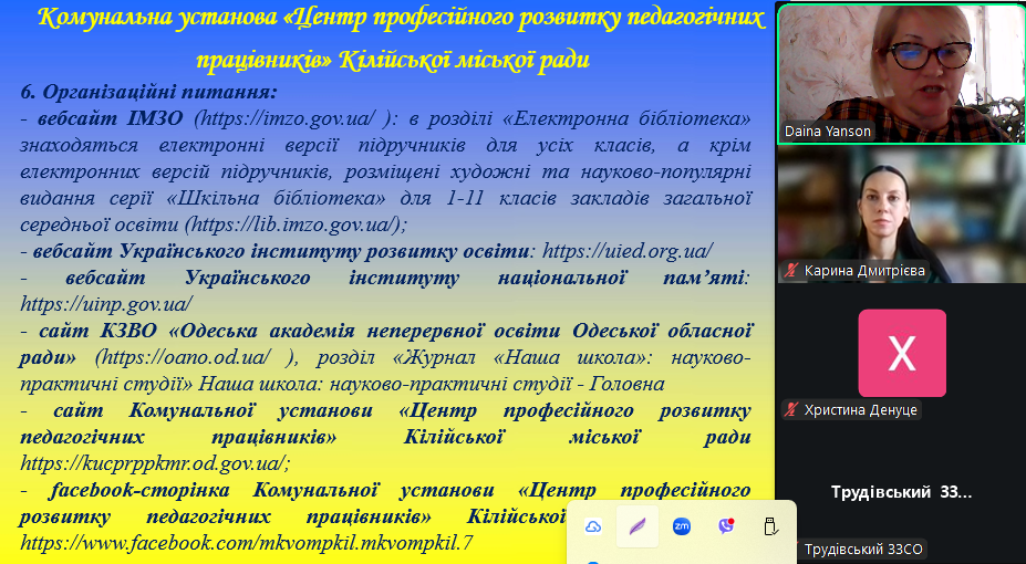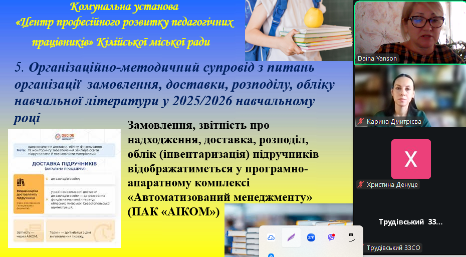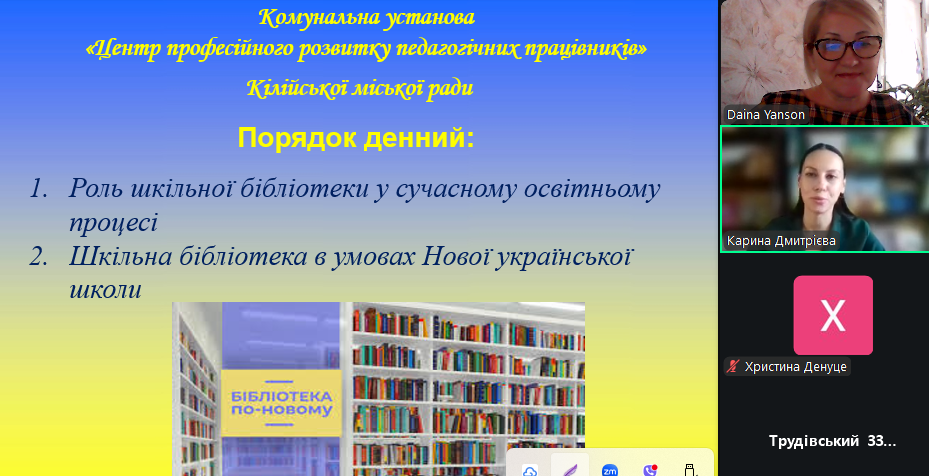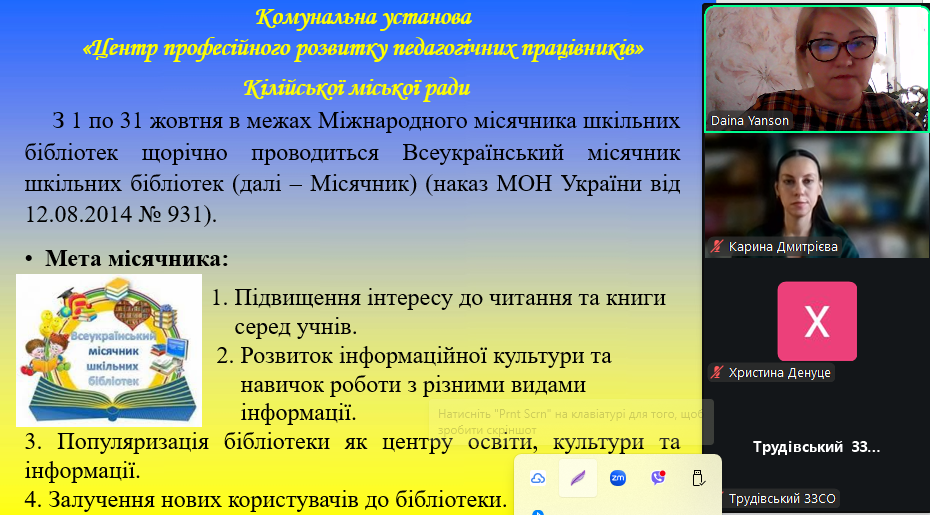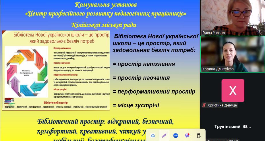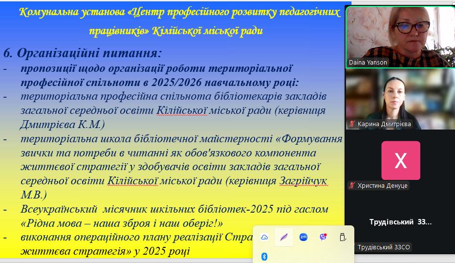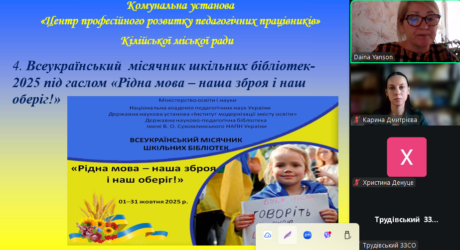 На виконання наказу Відділу освіти та молодіжної політики Кілійської міської ради «Про підготовку закладів та установ освіти Кілійської міської ради до початку 2025/2026 навчального року», відповідно до плану роботи Комунальної установи «Центр професійного розвитку педагогічних працівників» Кілійської міської ради, за координації консультантки Дайни Горбан, 26 вересня 2025 року, з метою забезпечення продуктивного старту нового навчального року, підтримки бібліотекарів, у режимі онлайн на платформі Zoom, було проведено територіальний інструктивно – методичний вебінар для бібліотекарів закладів загальної середньої освіти Кілійської міської ради на тему «Бібліотека – центр освітнього середовища закладу загальної середньої освіти» (керівниця територіальної професійної спільноти бібліотекарів закладів загальної середньої освіти – Дмитрієва Карина Миколаївна, бібліотекарка Кілійського закладу загальної середньої освіти № 2 Кілійської міської ради).