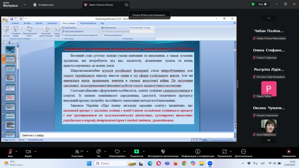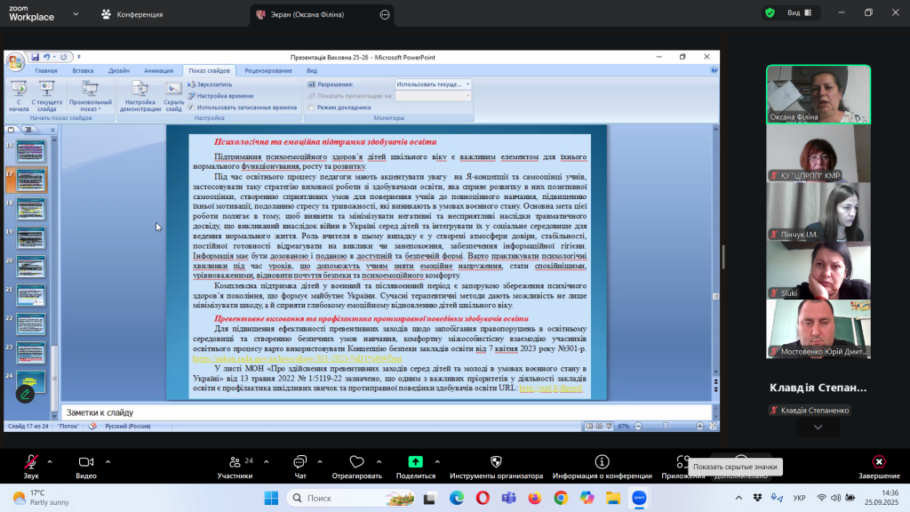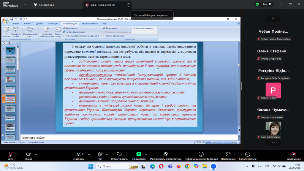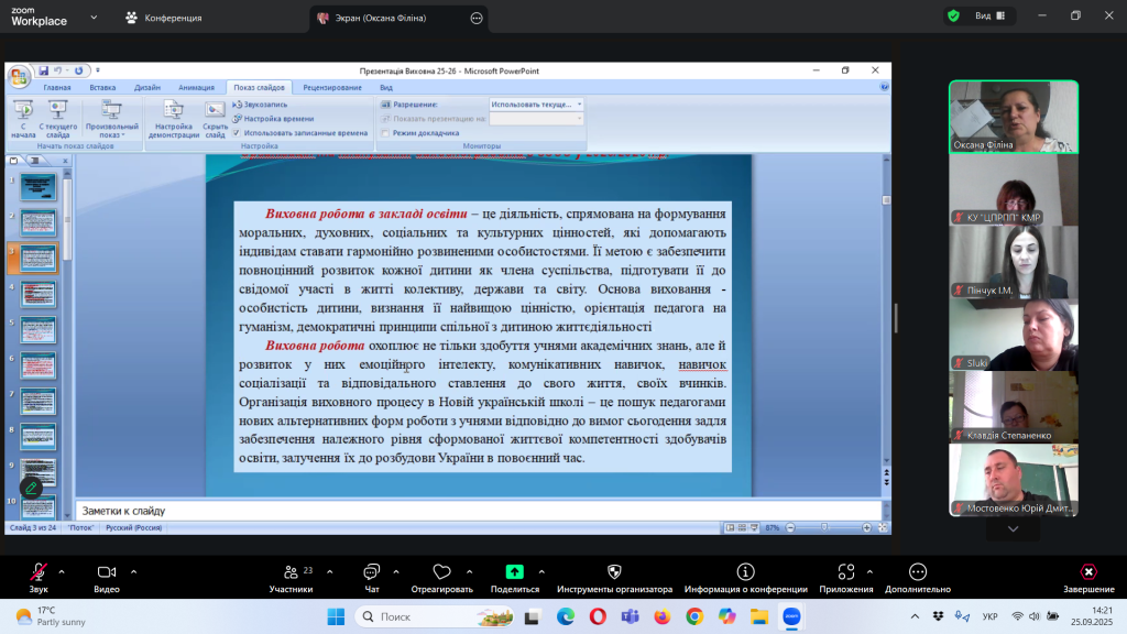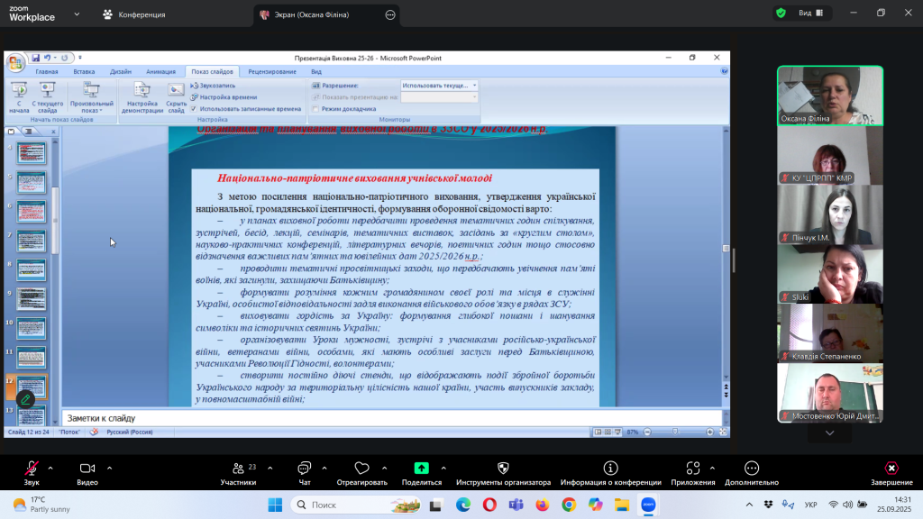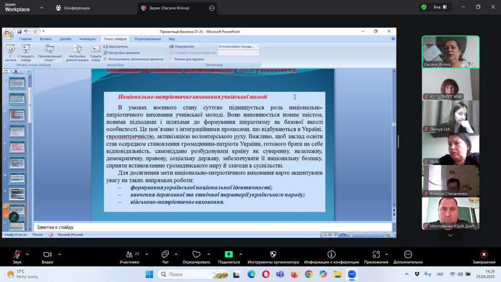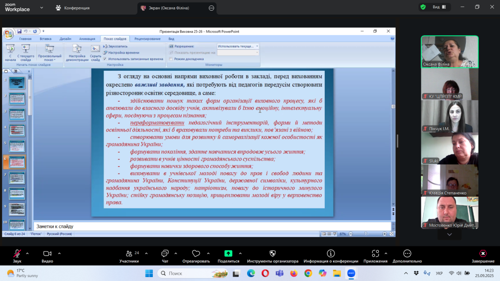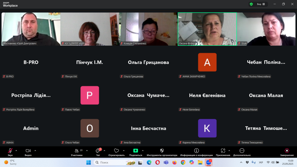 Відповідно до плану роботи Комунальної установи «Центр професійного розвитку педагогічних працівників» Кілійської міської ради, за координації консультантки Олени Барладян, 25 вересня 2025 року, у режимі онлайн на платформі Zoom, було проведено територіальний інструктивно – методичний вебінар для заступників директорів з навчально – виховної роботи/виховної роботи, педагогів-організаторів, керівників методичних об’єднань класних керівників закладів загальної середньої освіти Кілійської міської ради на тему «Особливості організації виховного процесу в закладі загальної середньої освіти в 2025/2026 навчальному році».