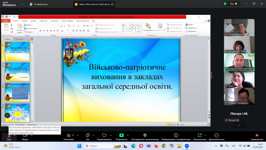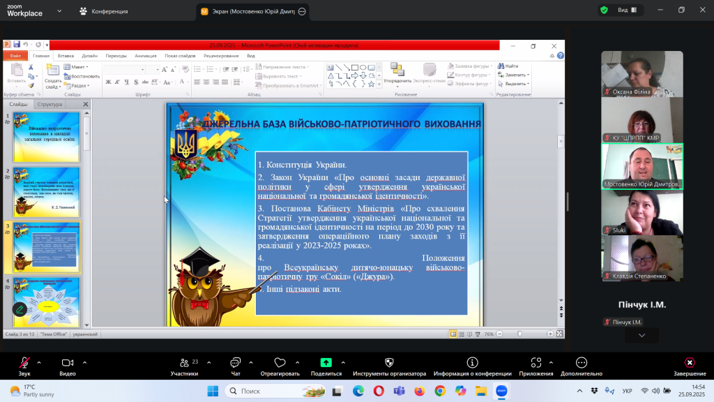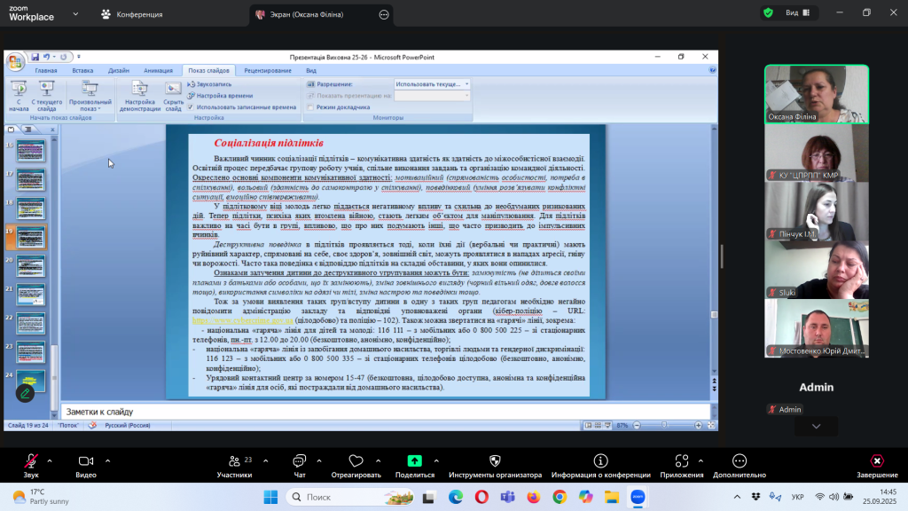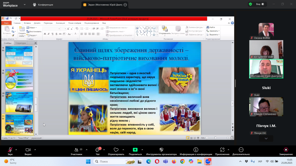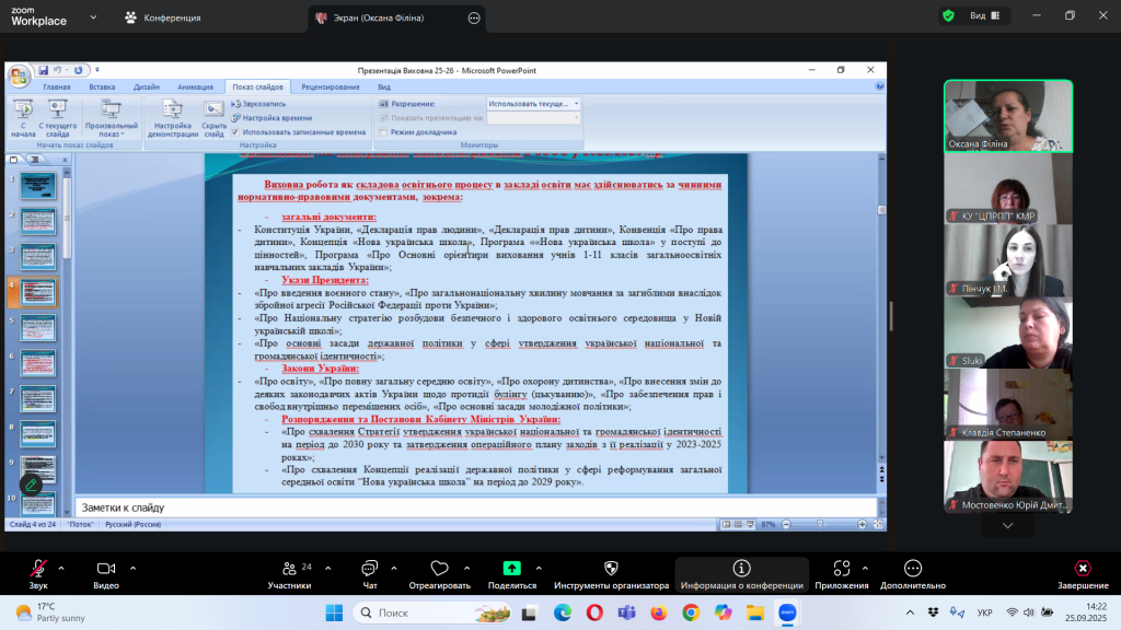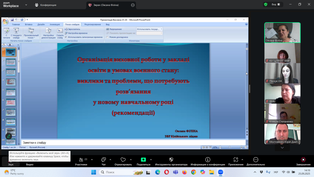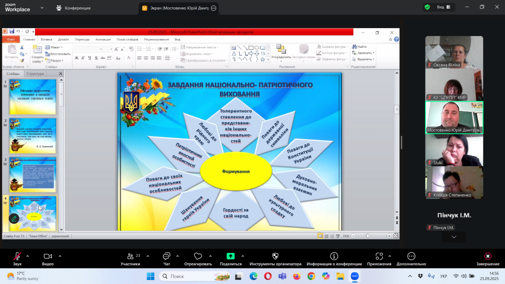 Відповідно до плану роботи Комунальної установи «Центр професійного розвитку педагогічних працівників» Кілійської міської ради, за координації консультантки Олени Барладян, 25 вересня 2025 року, у режимі онлайн на платформі Zoom, було проведено територіальний інструктивно – методичний вебінар для заступників директорів з навчально – виховної роботи/виховної роботи, педагогів-організаторів, керівників методичних об’єднань класних керівників закладів загальної середньої освіти Кілійської міської ради на тему «Особливості організації виховного процесу в закладі загальної середньої освіти в 2025/2026 навчальному році».