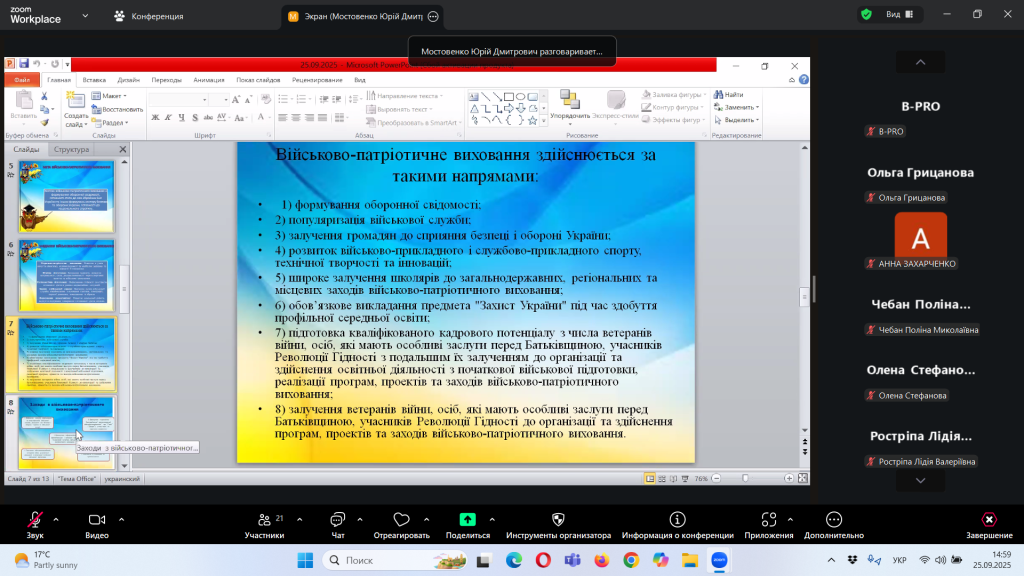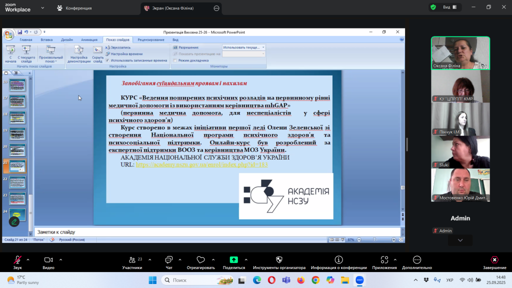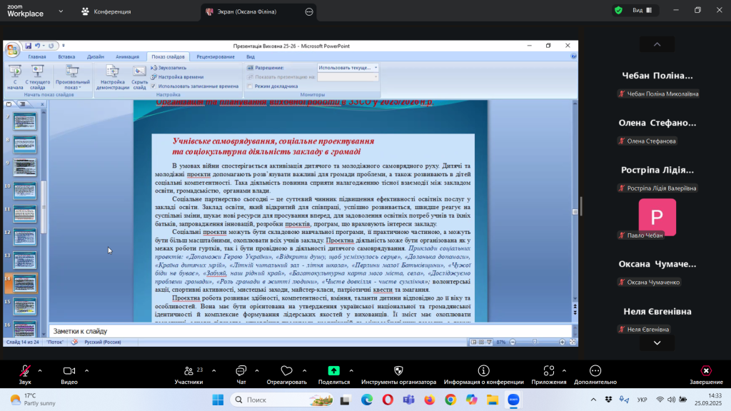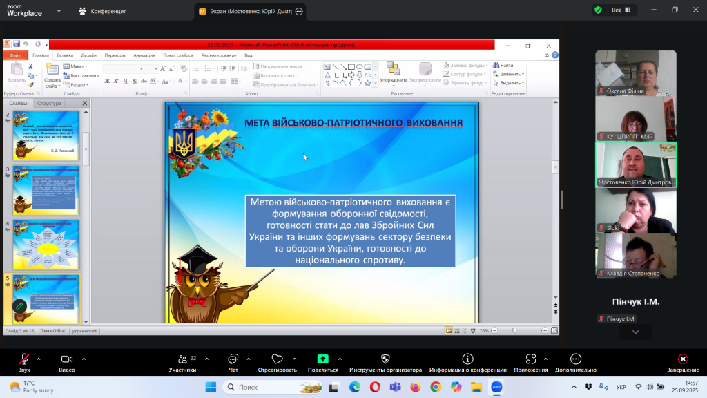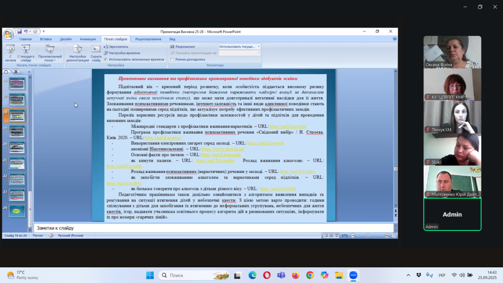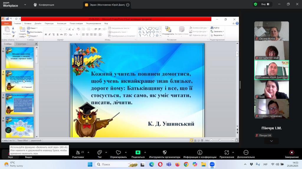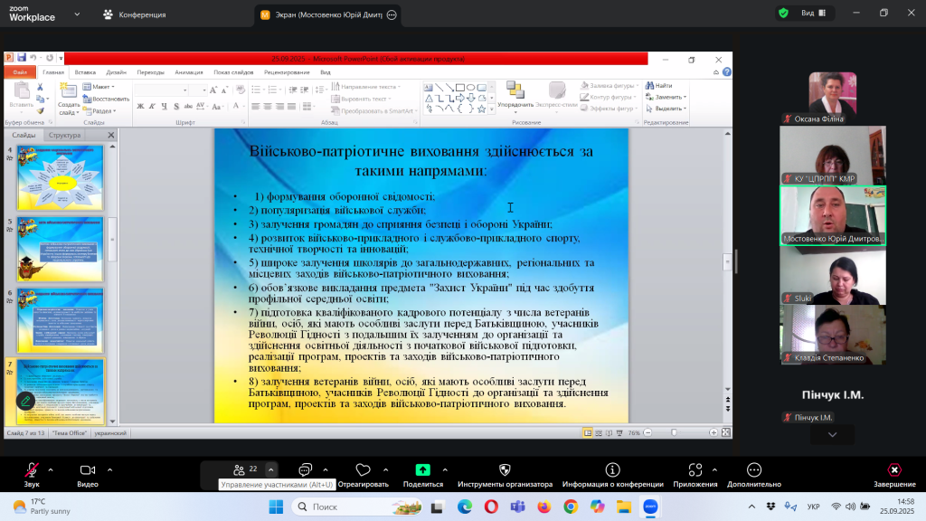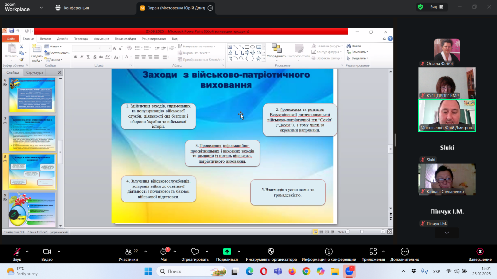 Відповідно до плану роботи Комунальної установи «Центр професійного розвитку педагогічних працівників» Кілійської міської ради, за координації консультантки Олени Барладян, 25 вересня 2025 року, у режимі онлайн на платформі Zoom, було проведено територіальний інструктивно – методичний вебінар для заступників директорів з навчально – виховної роботи/виховної роботи, педагогів-організаторів, керівників методичних об’єднань класних керівників закладів загальної середньої освіти Кілійської міської ради на тему «Особливості організації виховного процесу в закладі загальної середньої освіти в 2025/2026 навчальному році».