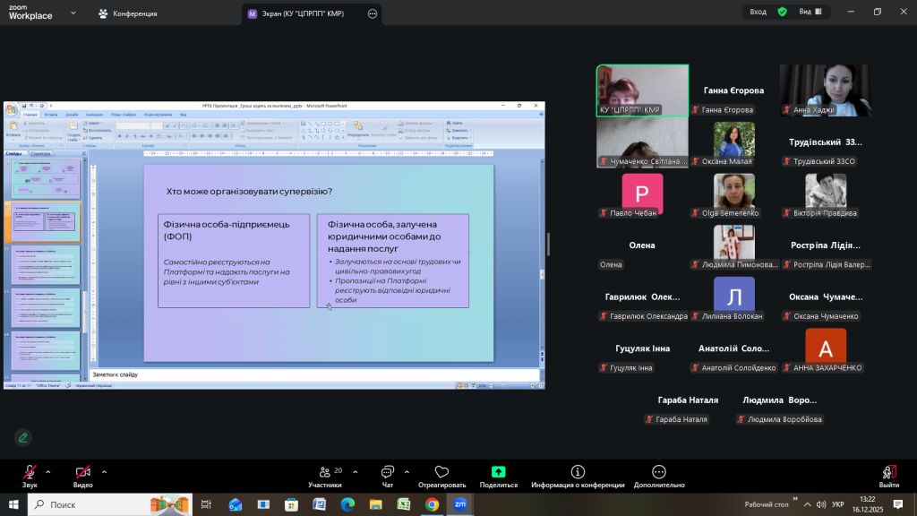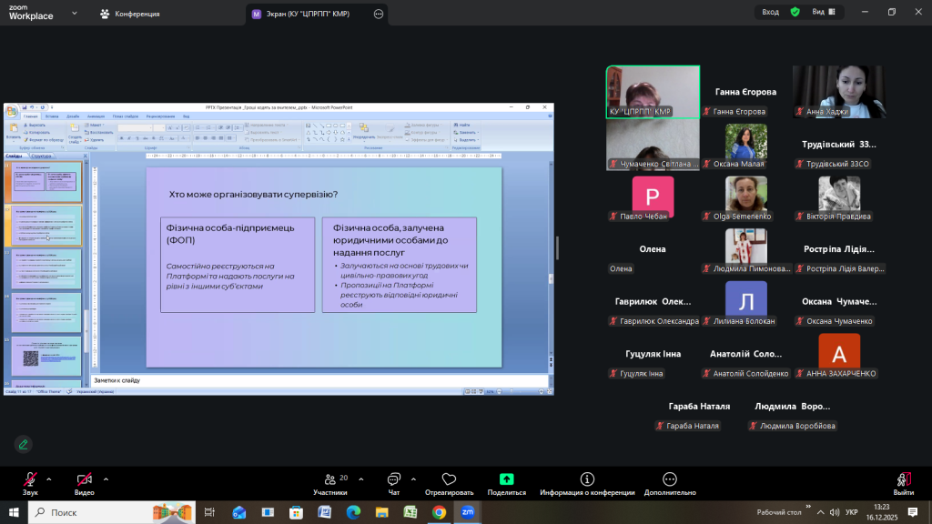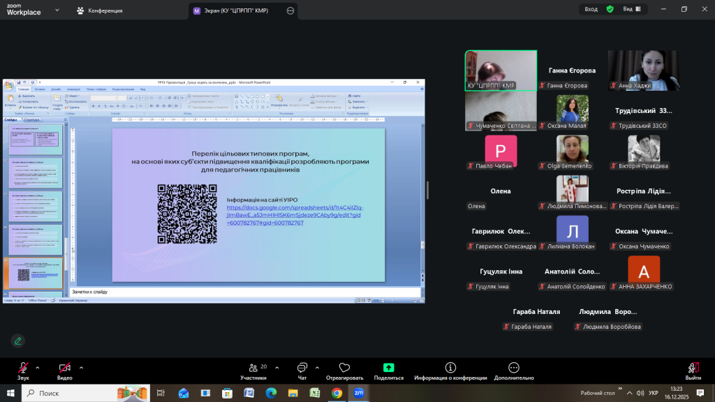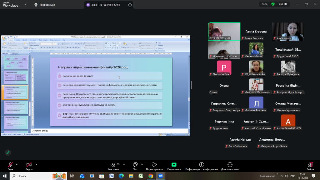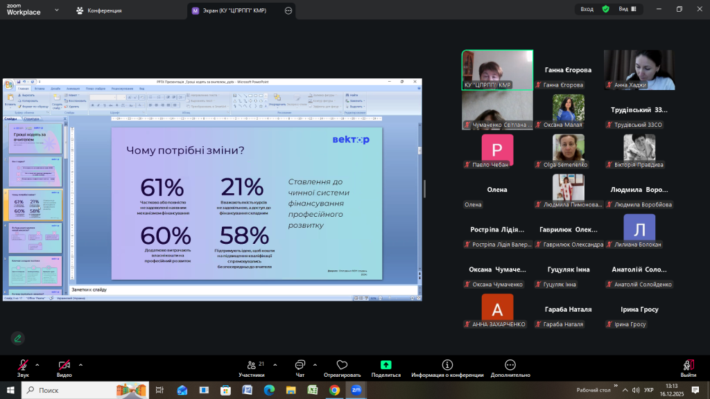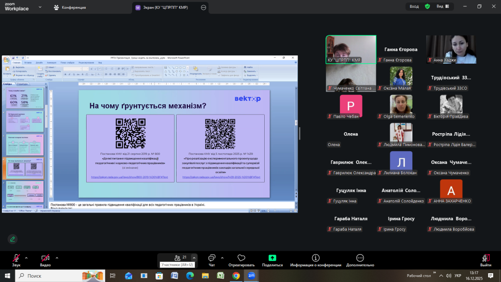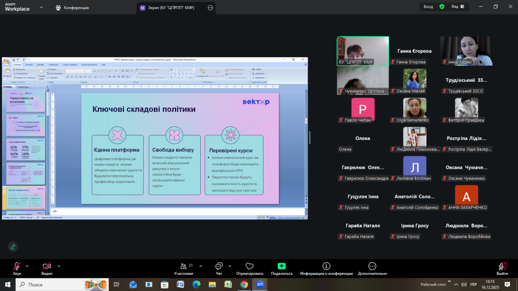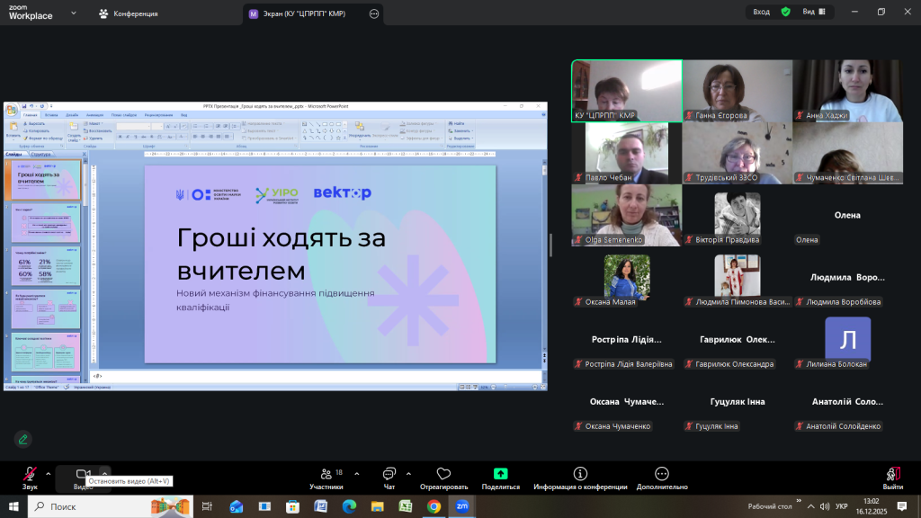 Відповідно до плану роботи Комунальної установи «Центр професійного розвитку педагогічних працівників» Кілійської міської ради 16 грудня 2025 року, з метою інформування щодо реалізації державної політики «Гроші ходять за вчителем», участі в експериментальному проєкті, у режимі онлайн на платформі Zoom, проведено територіальний методично – консультативний простір для заступників директорів з навчально-виховної роботи закладів загальної середньої освіти Кілійської міської ради на тему «Реалізація державної політики «Гроші ходять за вчителем»» (доповідачка – Єгорова Ганна Кирилівна, директорка Комунальної установи «Центр професійного розвитку педагогічних працівників» Кілійської міської ради).